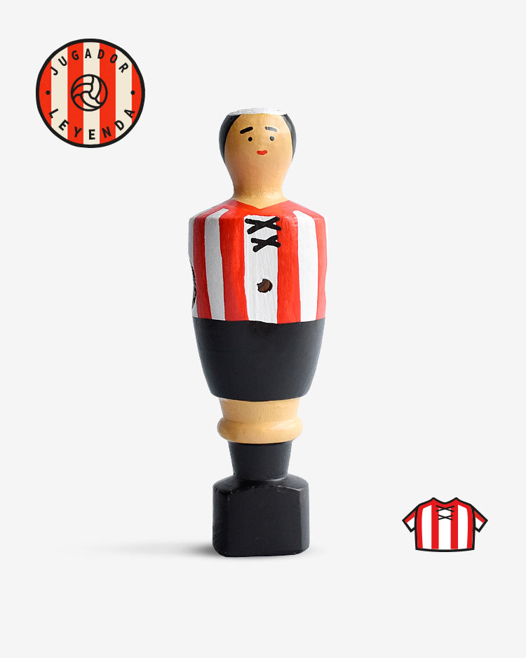 El día que el fútbol español encontró a su primer ídolo, él vestía de rojiblanco. Pichichi, leyenda del Athletic Club, dejó una huella imborrable en la historia del deporte rey. Ahora, su figura de futbolín, tallada en madera de haya y pintada a mano en nuestro taller, puede formar parte de tu colección de leyendas.
